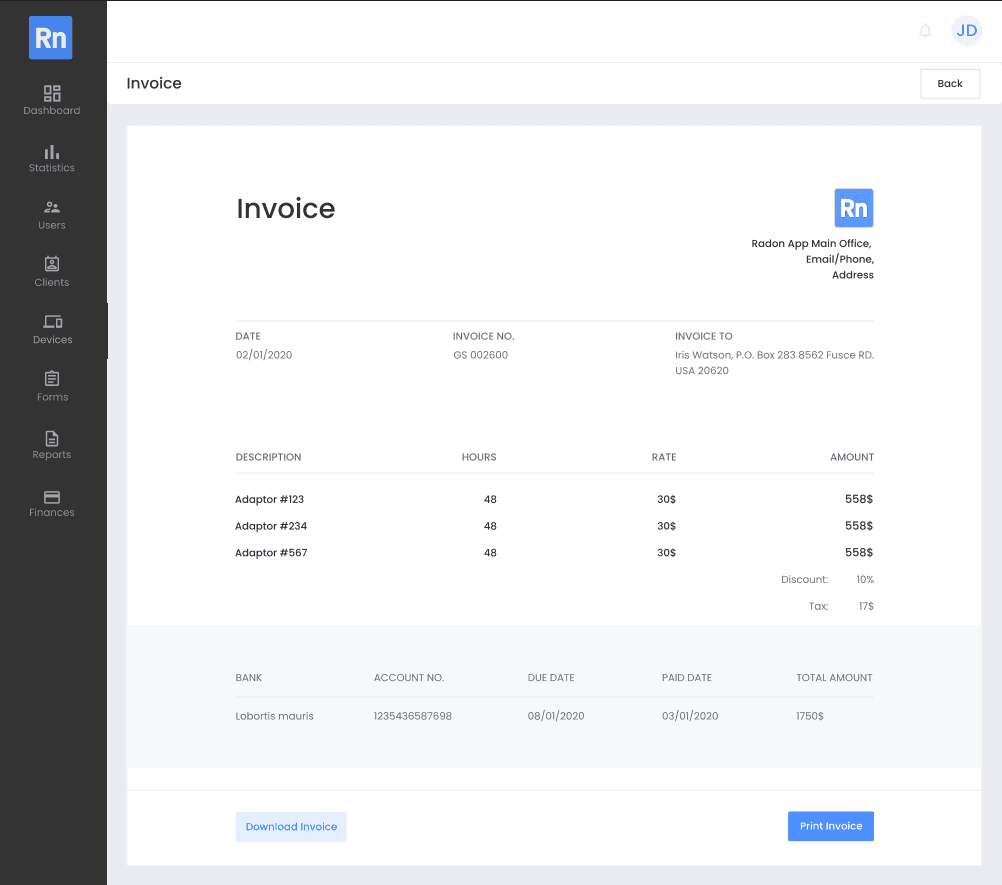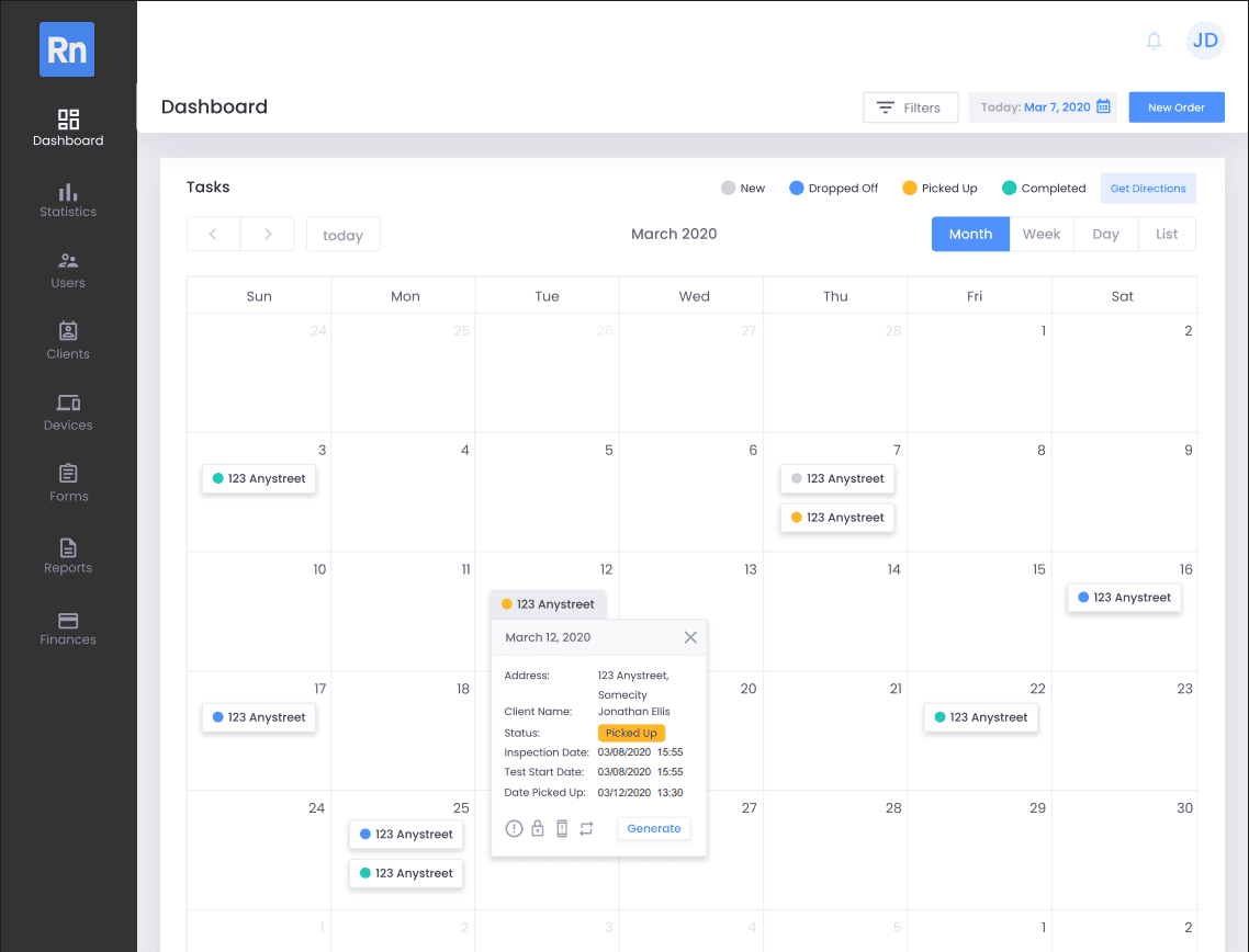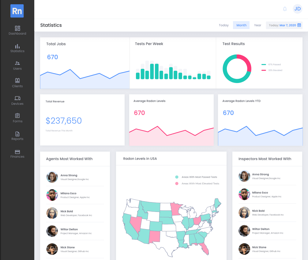 Radon is a web platform for radon testing companies to manage the full operational lifecycle, including order booking, inspector scheduling, route planning, device tracking, report generation, invoicing, and client payments. It was built to modernize a legacy, manual workflow and support both the core business and a paid-subscriber model for other radon testing companies.