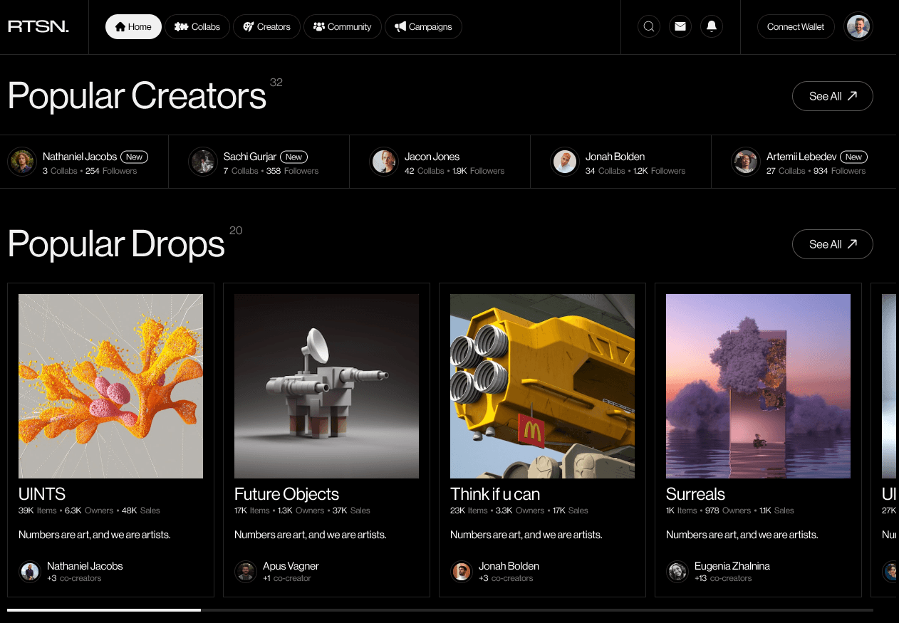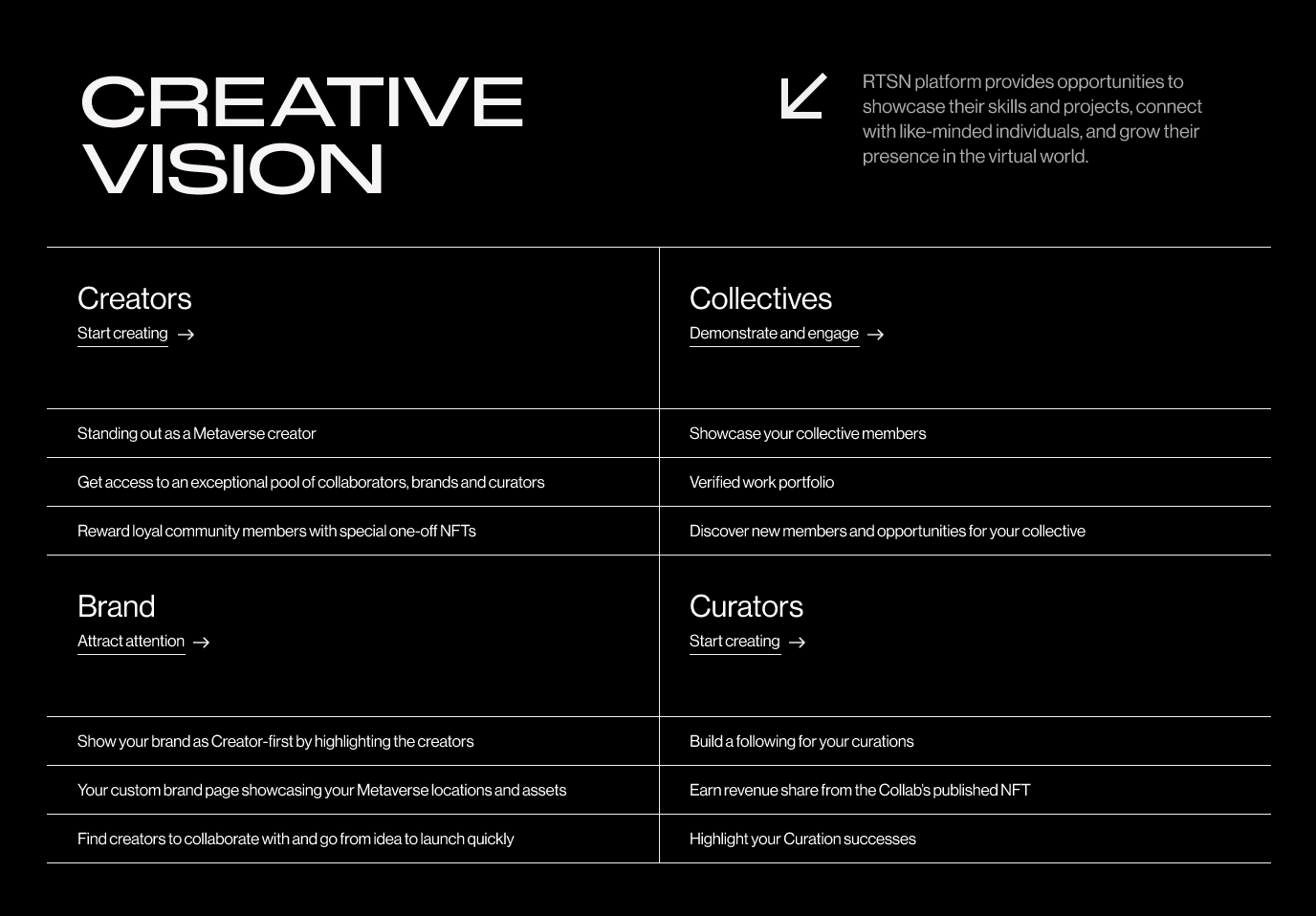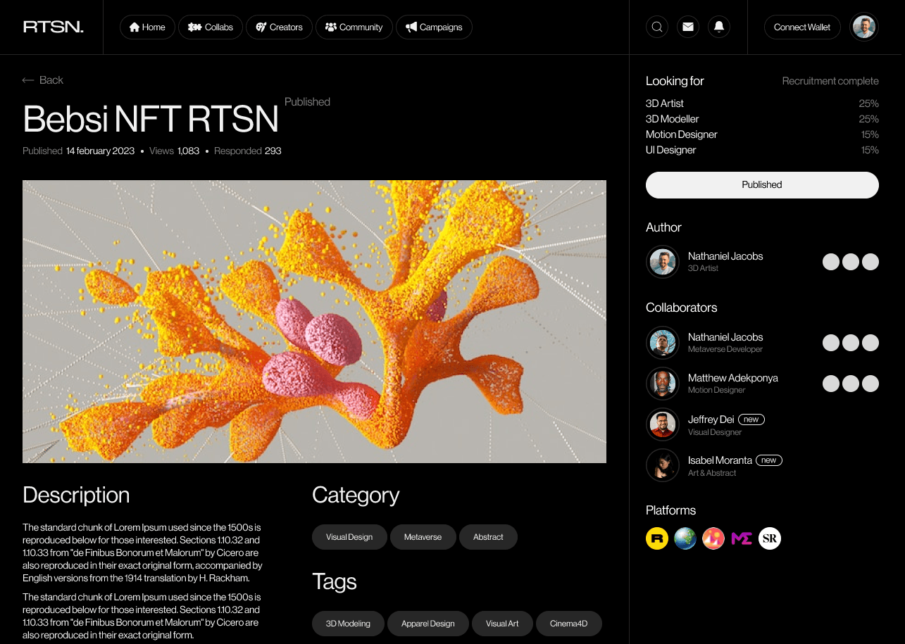 RTSN is a creator-focused platform designed to help artists, brands, and developers collaborate on digital and metaverse projects. It evolved from an initial NFT and metaverse concept into a full social and collaboration platform, combining creator profiles, collaboration workflows, gamification, payments, and AI-assisted ideation.
