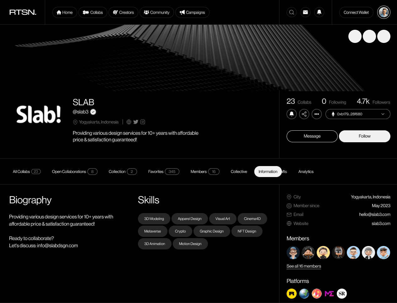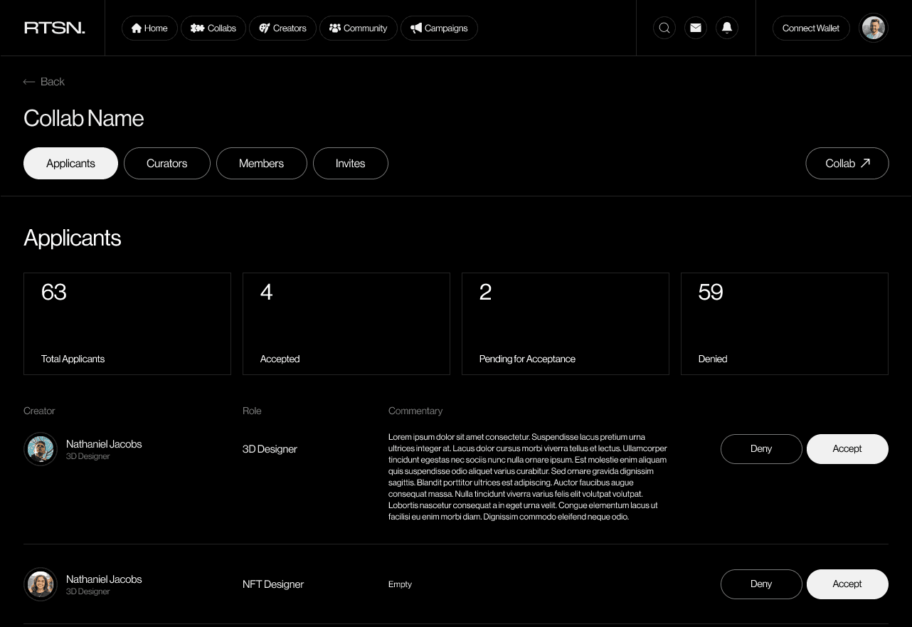 RTSN was developed into a scalable, product-grade platform that supported creator discovery, collaboration creation, applications, rewards, and monetization. The system combined social-network-style interactions with blockchain-based features and AI-assisted workflows.